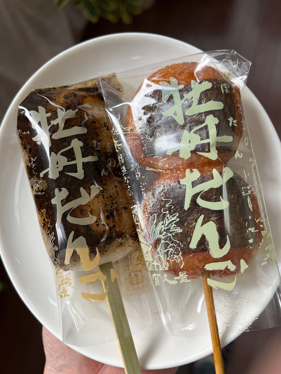「醤油の焼き団子」と、「あんこの入ったお団子にごまだれをまぶしたもの」